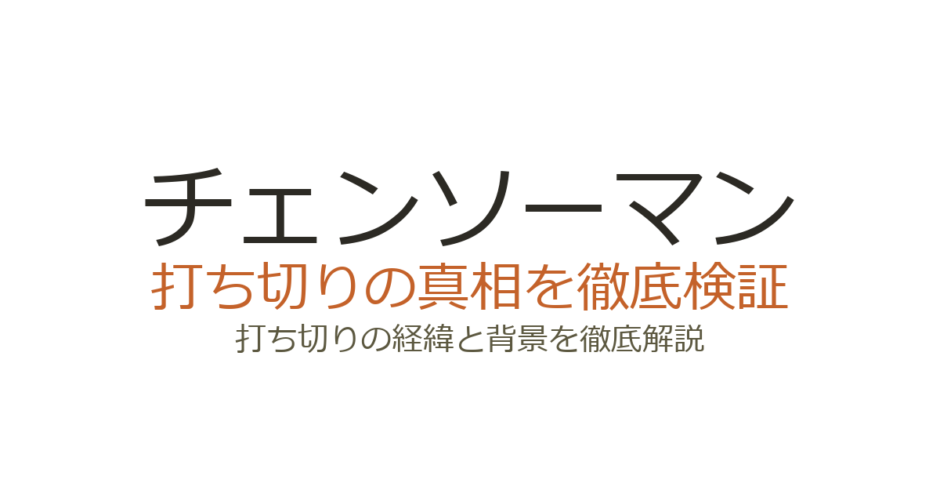 チェンソーマンは打ち切りではなく、第1部・第2部ともに最終話まで描き切って完結した作品です。第1部がわずか2年・全11巻で終了したことや、第2部で少年ジャンプ+へ移籍したことが「打ち切りでは?」という誤解を招きました。この記事では、チェンソーマンが打ち切りと言われた理由3つと、打ち切りではない根拠を客観的データとともに解説します。