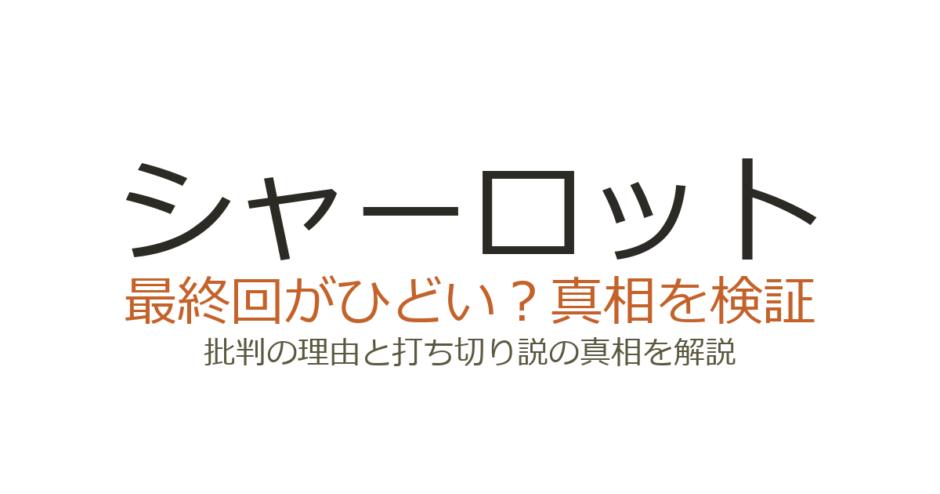 アニメ『Charlotte(シャーロット)』の最終回は、「1話で世界一周」という駆け足展開が批判を受け、「ひどい」と言われることが多い作品です。7話まで続いた学園コメディから一転、終盤で急にシリアス路線へと舵を切り、最終話で壮大なテーマを一気に畳んだことが不満の原因とされています。この記事では、最終回が批判される具体的な理由と、打ち切りだったのかどうかを客観的な事実をもとに解説します。