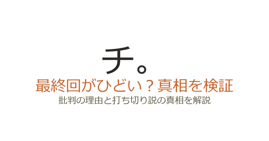 『チ。―地球の運動について―』の最終回は、漫画・アニメともに「ひどい」「意味不明」という批判と「深い」「感動した」という称賛が入り混じる賛否両論の結末でした。批判の中心にあるのは、死んだはずのラファウが最終章で突然再登場する展開や、コペルニクスの物語が描かれないまま終了した点です。この記事では、最終回がひどいと言われる具体的な理由と、打ち切りだったのかどうかを詳しく解説します。