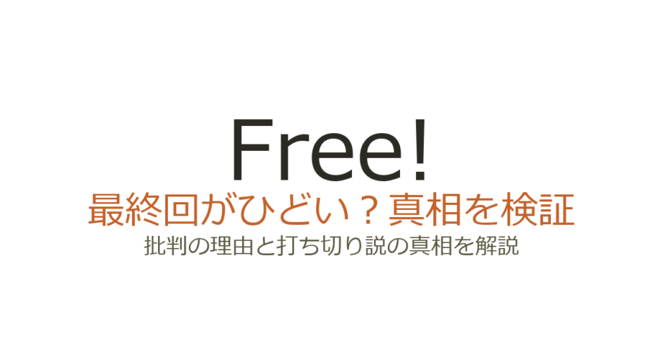 Free!の最終回(劇場版 Free!-the Final Stroke- 後編)は、キャラクターの扱いやストーリー展開をめぐって「ひどい」という声が一部のファンから上がりました。2013年のTV第1期から9年にわたるシリーズの完結作だけに、期待値の高さが賛否を分ける結果につながっています。この記事では、Free!の最終回が批判された具体的な理由と、打ち切りだったのかどうかを検証します。