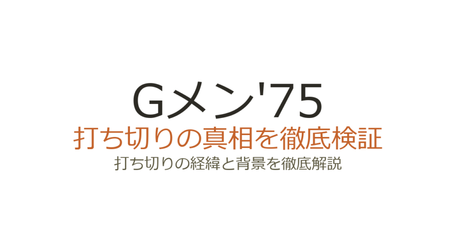 『Gメン’75』終了の直接的な原因は、TBSが土曜21時枠を1時間の連続ドラマから2時間のサスペンスドラマ枠に改編したことです。『Gメン’75』が1982年4月3日に最終回を迎えた翌週の4月10日から、同枠では『ザ・サスペンス』(毎週土曜21:02〜22:53)の放送がスタートしました。