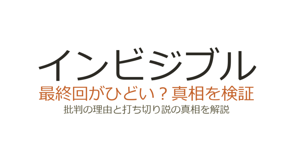 2022年放送のTBS金曜ドラマ『インビジブル』の最終回は、「脚本が残念」「結末が中途半端」と多くの視聴者から厳しい声が上がりました。視聴率が初回の9.4%から最終回には6.6%まで下がったことで「打ち切りだったのでは?」という疑惑もありますが、結論から言うと全10話で予定通り放送された完結作品です。この記事では、最終回がひどいと言われた具体的な理由と、打ち切り説の真相を解説します。
