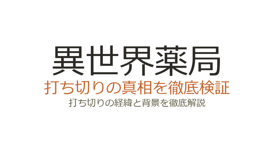 『異世界薬局』は打ち切りではなく、原作小説は全10巻で完結済み、漫画版は2026年現在も連載が続いています。原作者・高山理図のSNS炎上騒動や漫画版の更新間隔の長さから「打ち切りでは?」という噂が広まりました。この記事では、打ち切り説が出た理由3つと、打ち切りではない根拠を客観的なデータとともに解説します。