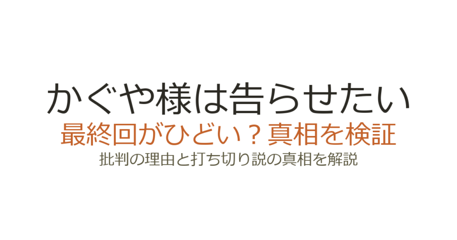 『かぐや様は告らせたい』の最終回は、終盤の路線変更や一部キャラクターの描写不足から「ひどい」と批判する声が上がりました。全28巻・全271話で完結しており打ち切りではありませんが、ラブコメからシリアス路線への急転換が読者の期待とのギャップを生んだことが主な原因です。この記事では、最終回が批判された具体的な理由と、打ち切り説の真相について詳しく解説します。