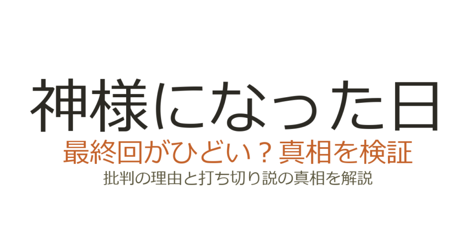 『神様になった日』の最終回は「ひどい」「期待外れ」という声が多く、麻枝准のオリジナルアニメとしては厳しい評価を受けました。前半8話の日常コメディから終盤3話で急にシリアス展開に切り替わった構成と、主人公・陽太の行動に対する不満が批判の中心です。この記事では、最終回が批判された具体的な理由と、打ち切りだったのかどうかを解説します。