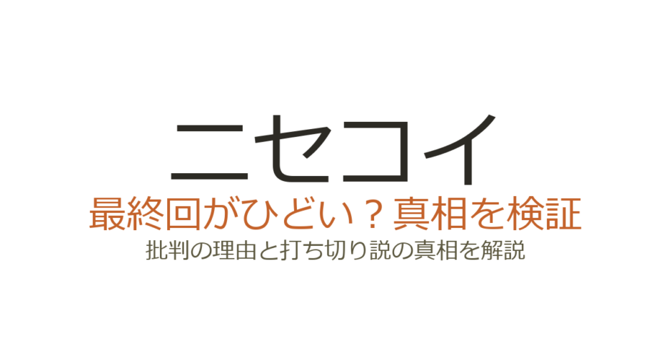 『ニセコイ』の最終回は、人気投票1位だった小野寺小咲ではなく桐崎千棘が選ばれたことで大きな議論を呼びました。鍵とペンダントの伏線が結末にほとんど影響しなかった点や、千棘を選ぶ理由の描写が抽象的だった点も批判の的になっています。この記事では、最終回が「ひどい」と言われる具体的な理由と、打ち切りだったのかどうかを検証します。