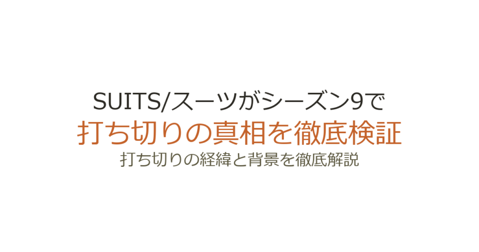 SUITS/スーツの終了は、制作者アーロン・コーシュとUSAネットワークが協議の上で決定したものです。2019年1月の時点でシーズン9がファイナルシーズンとなることが正式に発表されました。打ち切りの場合、通常は放送局側が一方的に決定を通知しますが、SUITS/スーツの場合は双方が合意の上での判断でした。