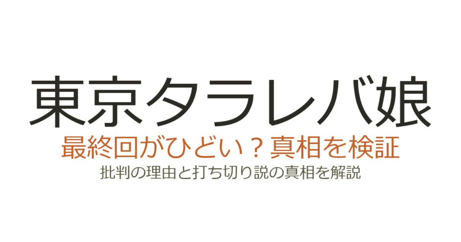 『東京タラレバ娘』の最終回は「結婚というゴールを放棄した」「消化不良」といった批判的な声が多く、賛否が大きく分かれました。最終回への不満は、物語のテーマが途中で方向転換したように感じられたことや、3人のヒロインの結末に差がありすぎたことが主な原因です。この記事では、最終回がひどいと言われる具体的な理由と、打ち切りだったのかどうかを詳しく解説します。